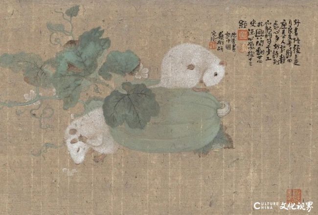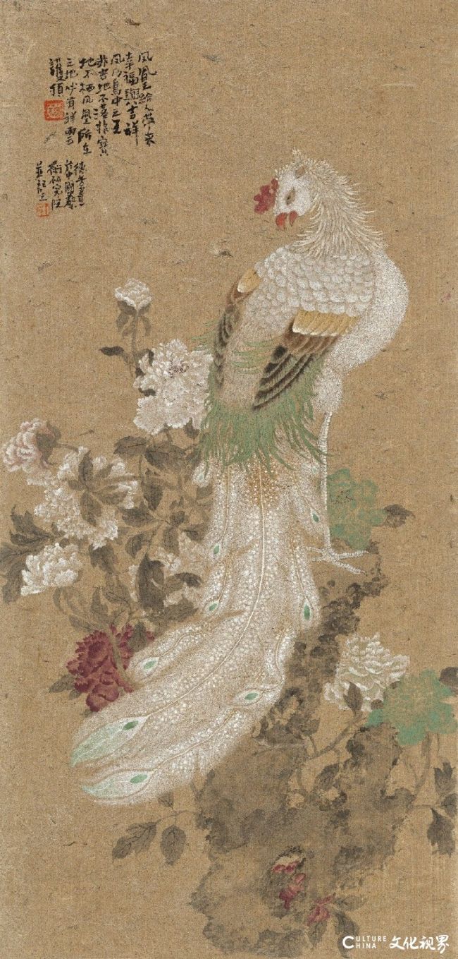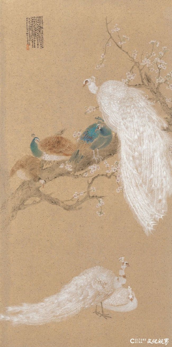 工笔之“工”,在她笔下从不是“匠气”的枷锁,而是“呼吸感”的载体。素羽禽鸟的翎毛,以丝毛皴染铺就,却不执着于每一缕的“实”——白孔雀的羽片叠着淡墨的轻晕,似揉碎的月光落纸,既见工笔的细腻,又留墨色的透气;花瓣的晕染不用浓色堆垛,只以淡赭、浅青层层积色,瓣尖的粉痕如晨露未干,与古纸的棕黄底色融成一片温软,不见笔触的生硬,只余物象的柔润。连枝桠的勾勒都藏着“松”:枯笔带过的枝节,留着墨色的漫漶,像风过枝梢的自然褶皱,让“工”的精细,落进了“逸”的疏朗里。