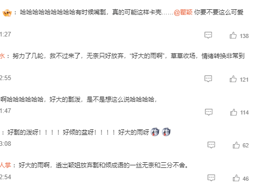 很多人回忆起,多年前,有一次,瞿颖发了一段下大雨的视频,本想感叹瓢泼大雨,却说成:“好瓢的泊呀!不是...呃...就好泼的瓢!嘶...好轻的泼...瓶....盆...呃.... 好大的雨啊!”