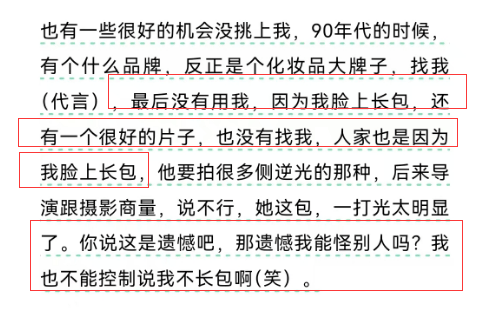 瞿颖接受采访的时候说,90年代的时候有化妆品大牌找她代言,也有很好的片子找她演,但因为那时候她脸上长包了,人家都没用她。