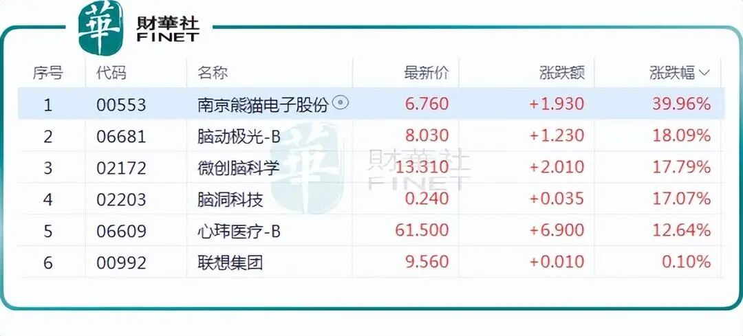 在港股市场,截至发稿,南京熊猫(维权)电子股份(00553.HK)飙升39.96%,脑洞极光-B(06681.HK)涨18.09%,微创脑科学(02172.HK)上涨17.79%,脑洞科技(02203.HK)涨17.07%,心玮医疗-B(06609.HK)涨12.64%。